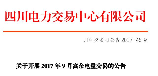 根據(jù)四川省經(jīng)濟和信息化委員會、四川省發(fā)展和改革委員會、國家能源局四川監(jiān)管辦公室、四川省能源局《關(guān)于印發(fā)四川省2017年直購電和富余電量政策實施方案的通知》(川經(jīng)信電力〔2017〕55號)、四川省經(jīng)濟和信息化委員會《關(guān)于印發(fā)2017年全省電力電量平衡方案及節(jié)能調(diào)度電力生產(chǎn)計劃的通知》(川經(jīng)信電力函〔2017〕62號)的要求,以及四川省2017年市場交易相關(guān)規(guī)則,決定于2017年8月23日開展9月份富余電量交易,有關(guān)事項公告如下: