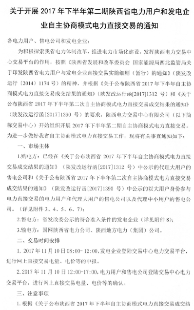 關(guān)于開展2017年下半年第二期陜西省電力用戶和發(fā)電企業(yè)自主協(xié)商模式電力直接交易的通知