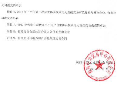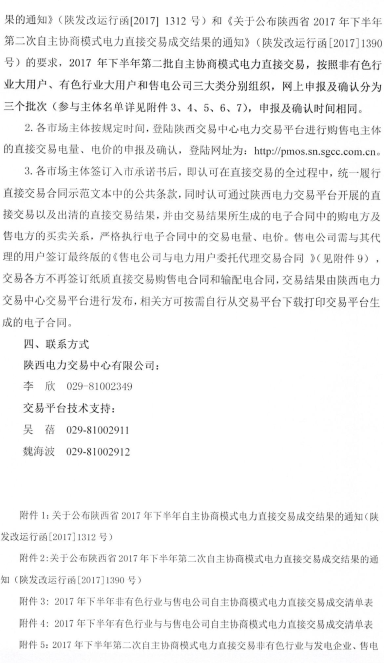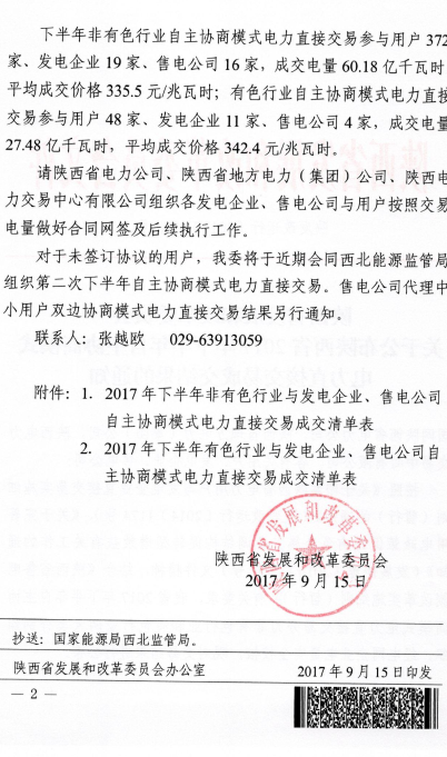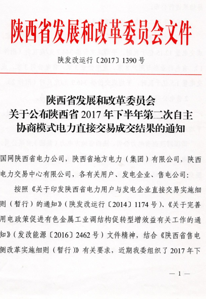 附件2:關(guān)于公布陜西省2017年下半年第二次自主協(xié)商模式電力直接交易成交結(jié)果的通知(陜發(fā)改運行函[2017]1390號)