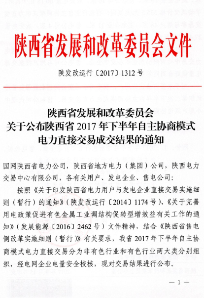 附件1:關(guān)于公布陜西省2017年下半年自主協(xié)商模式電力直接交易成交結(jié)果的通知(陜發(fā)改運行函[2017]1312號)