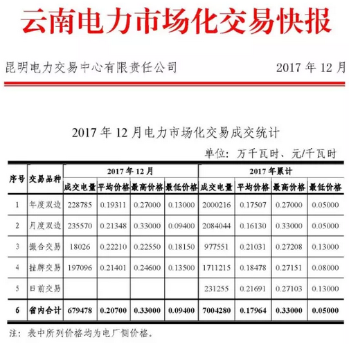 12月4日,昆明電力交易中心發(fā)布了《2017年12月電力市場化交易成交統(tǒng)計》,稱12月年度雙邊成交電量228785萬千瓦時,平均價格0 19311元 千瓦時,最高價格0 27元 千瓦時,最低價格0 13元 千瓦時。此外,統(tǒng)計還包括月