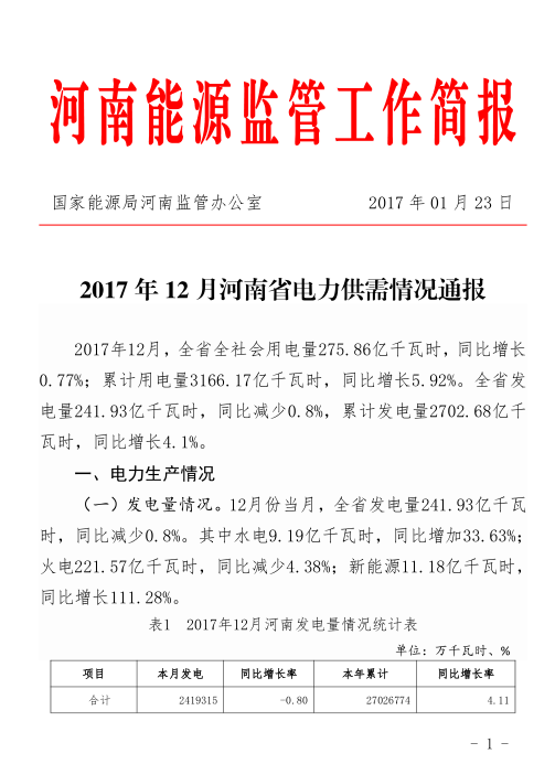 國(guó)家能源局河南監(jiān)管辦日前發(fā)布了2017年12月河南省電力供需情況通報(bào),2017年12月,河南省全社會(huì)用電量275 86億千瓦時(shí),同比增長(zhǎng)0 77%;累計(jì)
