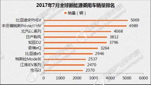 2017年7月全球電動(dòng)汽車銷量排名依次為比亞迪宋PHEV、豐田普銳斯Prime/PHV、北汽EC系列、日產(chǎn)聆風(fēng)、知豆D2、奇瑞eQ、比亞迪e5、特斯拉ModelX、江淮iEV系列、寶馬i3.