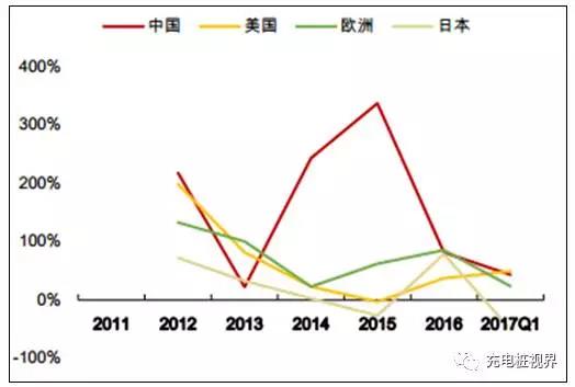 2014 年以前新能源汽車 市場以美歐日為主體,而隨著 2014 年以后中國政府開始大力推廣新能源汽車,中國新能源汽車全球市場份額從 2013 年的 6%迅速增長至 2016 年的 45%。16 年新能源乘用 車銷量達到 33.7 萬輛,遠(yuǎn)超美國的 15.8 萬輛,中國連續(xù)維持新能源汽車產(chǎn)銷第一。中國新能源汽車市場從 2014 年開始保持高速增長,14-15 年化增速 200%以上,16 年受 騙補和新政持續(xù)滯后等因素影響,銷量不達預(yù)期,但依然保持了 63%的高增速。17 年 Q1 由于受補貼新政、目錄重審、產(chǎn)業(yè)預(yù)期調(diào)整等影響增速有所下滑,但隨著 17 年 2-3 月份銷量增速回升(同比 70%以上),市場信心開始逐步回暖。