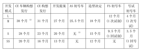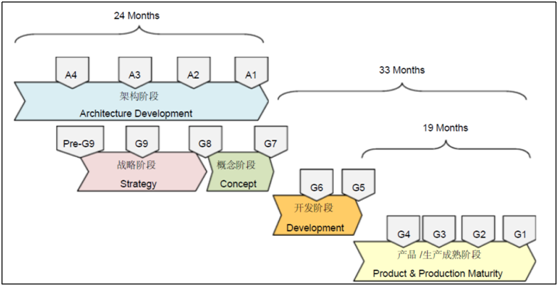 不僅如此,第二類、第三類車企通常都建立了嚴(yán)謹(jǐn)、周密的研發(fā)流程,比如長安CA-PDS、通用GVDP 5.0、豐田新車開發(fā)流程等,而這些流程都對(duì)新車開發(fā)的時(shí)間做了非常嚴(yán)格的規(guī)定。比如通用GVDP 5.0的完整用時(shí)是57個(gè)月左右,也就是4.75年左右。