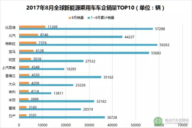 2017年8月全球新能源乘用車車企銷量TOP10
