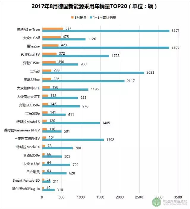 從8月月度銷量排名來看,8月銷量為537臺的奧迪A3 e-Tron奪得月度銷量冠軍;大眾e-Golf排在了第二位,8月銷售了475臺;雷諾Zoe銷售了423臺,排在第三位。