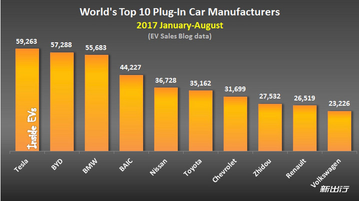 新出行點(diǎn)評(píng):位列第一的依然是特斯拉,旗下兩款車型 Model S 和 Model X 受歡迎程度持續(xù)不減,明年開始隨著 Model 3 的交付,有繼續(xù)領(lǐng)銜全球的勢(shì)頭。比亞迪以 2000 輛左右的差距位居第二,從明年開始比亞迪將有多款新能源車上市,也值得期待。