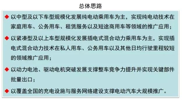 在應(yīng)用領(lǐng)域上,中型及以下車型規(guī)?;l(fā)展純電動乘用車為主,實(shí)現(xiàn)純電動技術(shù)在家庭用車、公務(wù)用車、租賃服務(wù)以及短途商用車等領(lǐng)域的推廣應(yīng)用;以緊湊型及以上車型規(guī)?;l(fā)展插電式混合動力乘用車為主,實(shí)現(xiàn)插電式混合動力技術(shù)在私人用車、公務(wù)用車以及其他日均行駛里程較短的領(lǐng)域推廣應(yīng)用,以動力電池、驅(qū)動電機(jī)突破發(fā)展支撐整車競爭力提升并實(shí)現(xiàn)關(guān)鍵部件批量出口,以覆蓋全國的充電設(shè)施與服務(wù)網(wǎng)絡(luò)建設(shè)支撐電動汽車大規(guī)模推廣。