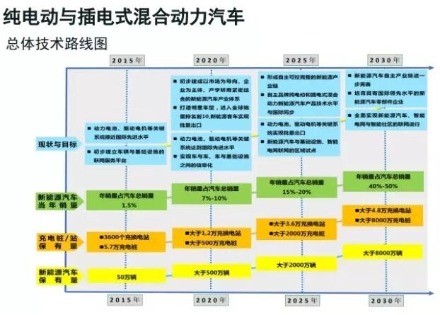 總體技術(shù)路線圖指出,2015-2020 新能源汽車年銷量超過總銷量7%;2020-2025 新能源汽車年銷量超過總銷量15%; 2025-2030 新能源汽車年銷量超過總銷量40%。
