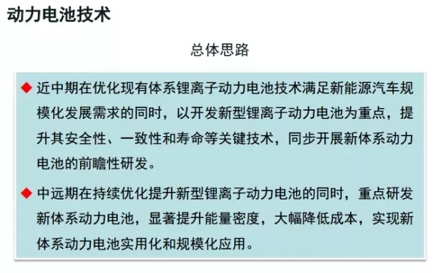 汽車動力電池技術(shù)路線以高安全,高比能,長壽命,低成本為總目標(biāo),以電池材料研發(fā)為核心,以能量型和能量功率兼顧型動力電池產(chǎn)品為重點(diǎn),以先進(jìn)制造技術(shù)裝備為保障,遠(yuǎn)近結(jié)合,統(tǒng)籌推進(jìn)新型鋰離子電池和新體系電池的研發(fā)和產(chǎn)業(yè)化,近期主要以提升現(xiàn)有體系電池性能為主,支撐目前新能源汽車技術(shù)快速發(fā)展,中期以開發(fā)新體系電池為主,突破核心技術(shù),遠(yuǎn)期實(shí)現(xiàn)新體系電池的產(chǎn)業(yè)化。