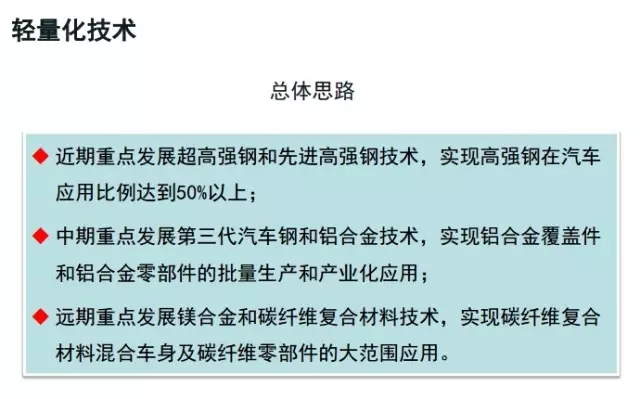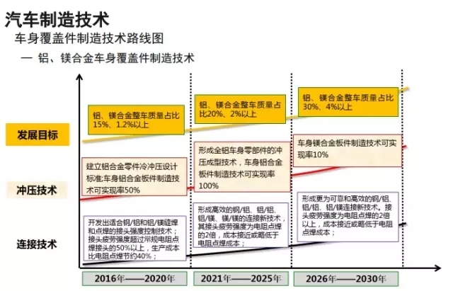 2016年-2020年為第一階段,重點(diǎn)發(fā)展超高強(qiáng)度鋼和先進(jìn)高強(qiáng)度鋼技術(shù),包括材料性能開發(fā),輕量化設(shè)計方法,成型技術(shù),焊接工藝和測試評價方法等,實(shí)現(xiàn)高強(qiáng)度鋼在汽車應(yīng)用比例達(dá)到50%以上,開展鋁合金板材沖壓制作技術(shù)研究并在車身實(shí)踐,研究不同材料的連接技術(shù)。