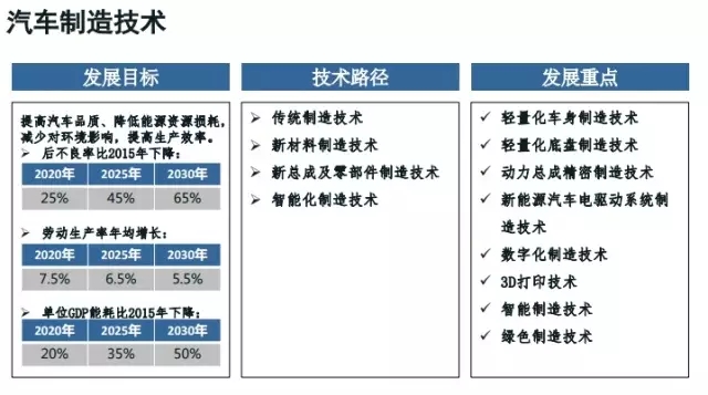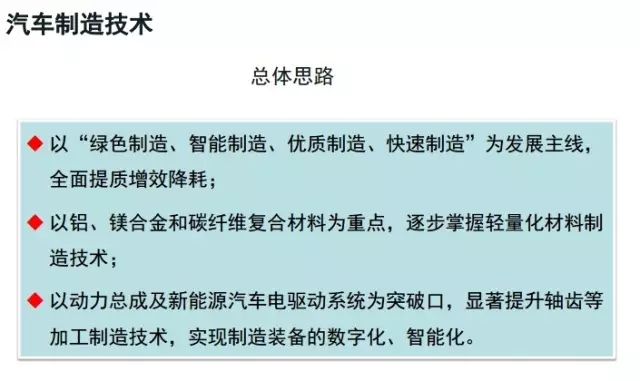 汽車制造技術(shù)路線圖以“綠色制造,智能制造,優(yōu)質(zhì)制造,快速制造”為發(fā)展主線,全面提質(zhì)增效降耗,以鋁鎂合金和碳纖維復(fù)合材料為重點(diǎn),逐步掌握輕量化材料制造技術(shù),以動力總成及新能源汽車電驅(qū)動系統(tǒng)為突破口,顯著提升軸、齒等零部件的加工制造技術(shù),實(shí)現(xiàn)制造裝備的數(shù)字化、智能化。