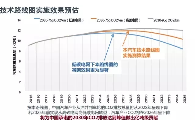 如果2030年按本次路線圖提出的75g/km、新能源汽車占銷量40%以上測算,我國汽車產(chǎn)業(yè)從油井到車輪的CO2排放總量將從2028年就開始呈現(xiàn)下降趨勢,如果2025年前我國電網(wǎng)能實(shí)現(xiàn)從高碳電網(wǎng)向低碳電網(wǎng)的轉(zhuǎn)型,汽車產(chǎn)業(yè)從油井到車輪的CO2排放總量將在2026年之后就開始明顯下降。