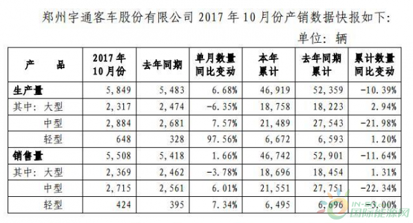 11月3日,鄭州宇通客車股份有限公司(以下簡稱:宇通客車)發(fā)布2017年10月份產(chǎn)銷數(shù)據(jù)快報??靾箫@示,10月份,宇通客車銷售客車車型5508輛,環(huán)比銷量出現(xiàn)下滑,但同比實現(xiàn)了1.66%的微漲。