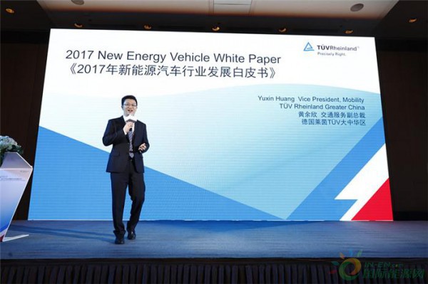 圖為:TUV萊茵大中華區(qū)交通服務(wù)副總裁黃余欣發(fā)布《2017年中國(guó)新能源汽車行業(yè)發(fā)展白皮書》