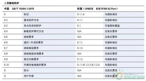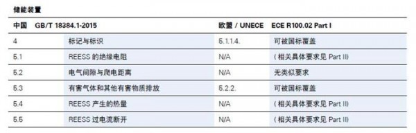 可以看到在常規(guī)電氣安全方面,中國(guó)方面最主要的標(biāo)準(zhǔn)是GB/T 18384系列標(biāo)準(zhǔn),其主要修改采用了ISO 6469系列標(biāo)準(zhǔn);歐盟主要的法規(guī)是ECE R100的02修訂本,其中第一部分是針對(duì)整車的安全要求,第二部分是針對(duì)REESS即儲(chǔ)能裝置的零部件認(rèn)證要求,在下表中列出了國(guó)標(biāo)在儲(chǔ)能裝置,操作安全及故障防護(hù),人員觸電防護(hù)方面的法規(guī)條目,以及歐標(biāo)與國(guó)標(biāo)的條目對(duì)照和內(nèi)容異同。美國(guó)對(duì)于常規(guī)電氣安全則并沒(méi)有強(qiáng)制的標(biāo)準(zhǔn)。