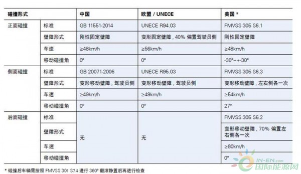 電動(dòng)汽車除了要保證正常行駛狀態(tài)下的安全性以外,也要保證車輛在發(fā)生碰撞事故后的電氣安全性,下表顯示了中美歐對(duì)于碰撞測(cè)試后車輛的電氣安全的考核標(biāo)準(zhǔn)的異同,可以看到三者的標(biāo)準(zhǔn)要求比較近似,但其實(shí)最大的差異體現(xiàn)在標(biāo)準(zhǔn)規(guī)定的碰撞測(cè)試的形式。中國(guó)和歐盟都只要求在正面碰撞和側(cè)面碰撞測(cè)試中考核電氣安全,而美國(guó)的FMVSS 305不但規(guī)定了要在正面、側(cè)面和后面碰撞以及翻滾測(cè)試中考察電氣安全,而且測(cè)試要在駕駛員和副駕駛員兩側(cè)分別進(jìn)行,碰撞后車輛需按照FMVSS 301 S7.4進(jìn)行360?翻滾靜置后再進(jìn)行檢查,因此測(cè)試的復(fù)雜度和嚴(yán)苛度大大增加。