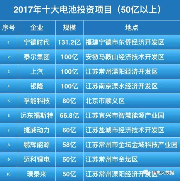50億起步!2017年十大鋰電池投資項(xiàng)目盤(pán)點(diǎn)!