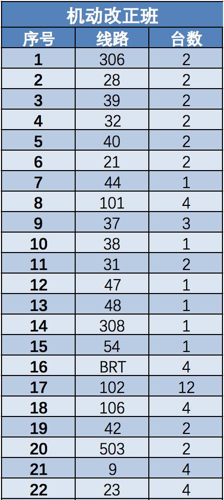 機動改正路線:306、28、39、32、40、21、44、101、37、38、31、47、48、308、54、BRT、102、106、42、503、9、23、15、313、315、16、29、35、1、301、30、502、531、302、304、312、316、401、19、22、33、20、101A、25、317、323、105、43、18、3、4、311、401、501、49
