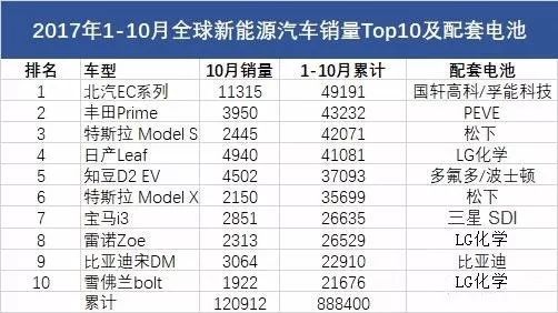新能源汽車(chē)市場(chǎng)的火爆,動(dòng)力電動(dòng)市場(chǎng)也水漲創(chuàng)高,下面盤(pán)點(diǎn)一下1-10月銷(xiāo)量榜前十車(chē)型配套的動(dòng)力電池,來(lái)看看這些幕后的功臣。EV Sales發(fā)布的數(shù)據(jù)顯示,2017年10月全球新能源銷(xiāo)量增長(zhǎng)再創(chuàng)新高,超過(guò)12萬(wàn)輛,達(dá)到1