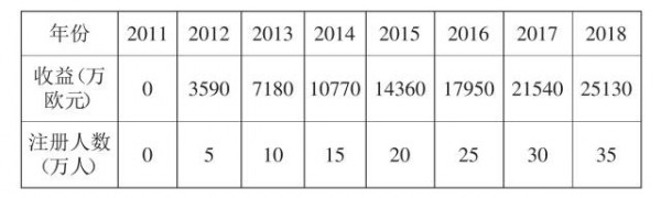 根據(jù)表2 中的數(shù)據(jù)及其反映的經(jīng)濟(jì)意義,為了推測其未來的利潤情況,按照一定的方法將上面的數(shù)據(jù)延伸至 2018 年,具體的延伸依據(jù)是:從 2011 年到2014 年,注冊會員從零增加到大約 15 萬人,在 2014 年,其收入為10770 萬歐元。按照會員人數(shù)和收入之間的對應(yīng)關(guān)系,可以估算出2015 年以后每一年會員人數(shù)和收入的變化情況,按照這種規(guī)律則得出表 3 所示的預(yù)計(jì)。