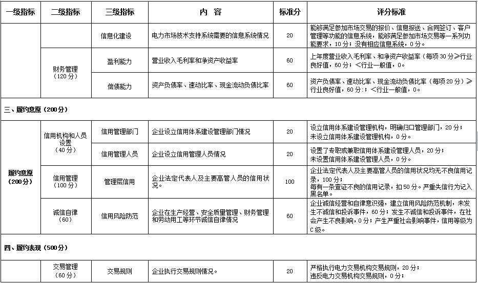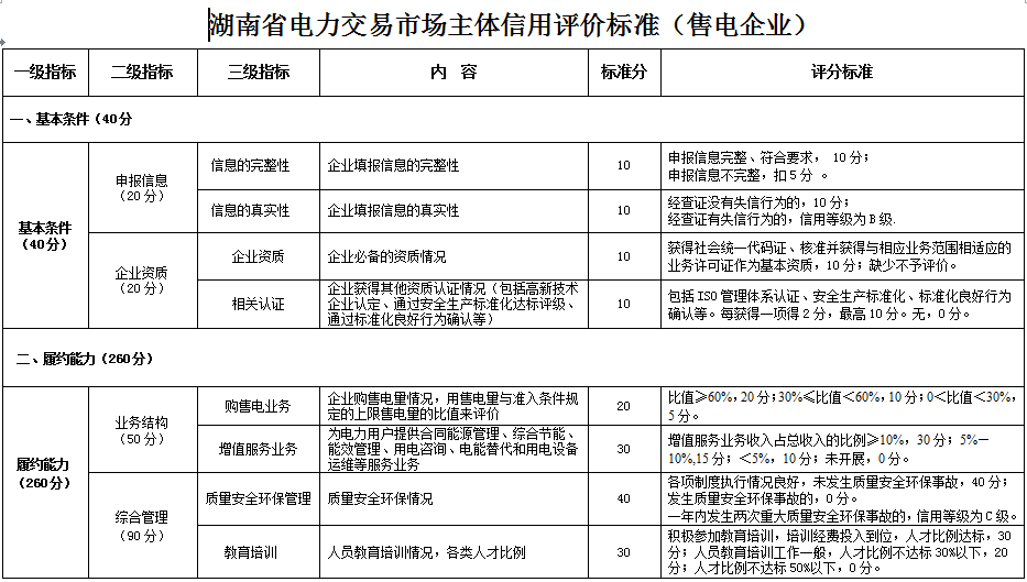 湖南省經(jīng)信委日前發(fā)布了關于征求《湖南省電力交易市場主體信用評價管理工作暫行辦法》(征求意見稿),辦法中包含電力用戶、售電公司和發(fā)電企業(yè)的信用評價標準?!缎庞迷u價標準》根據(jù)各市場主體市場功能不同,分