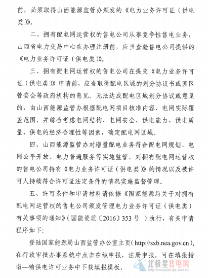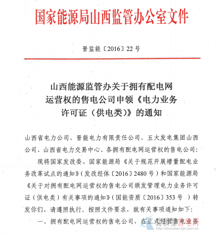 山西能源監(jiān)管辦關(guān)于擁有配電網(wǎng)運(yùn)營(yíng)權(quán)的售電公司申請(qǐng)《電力業(yè)務(wù)許可證(供電類)》的通知近日發(fā)布,一起來(lái)看通知全文: