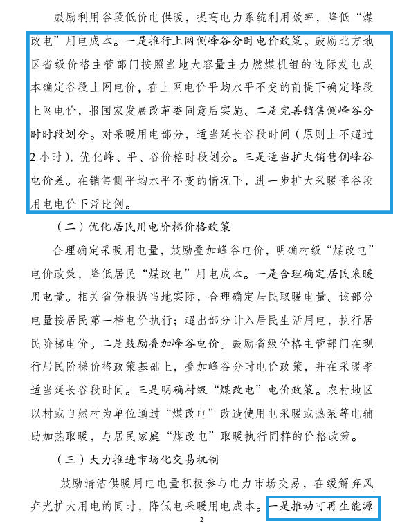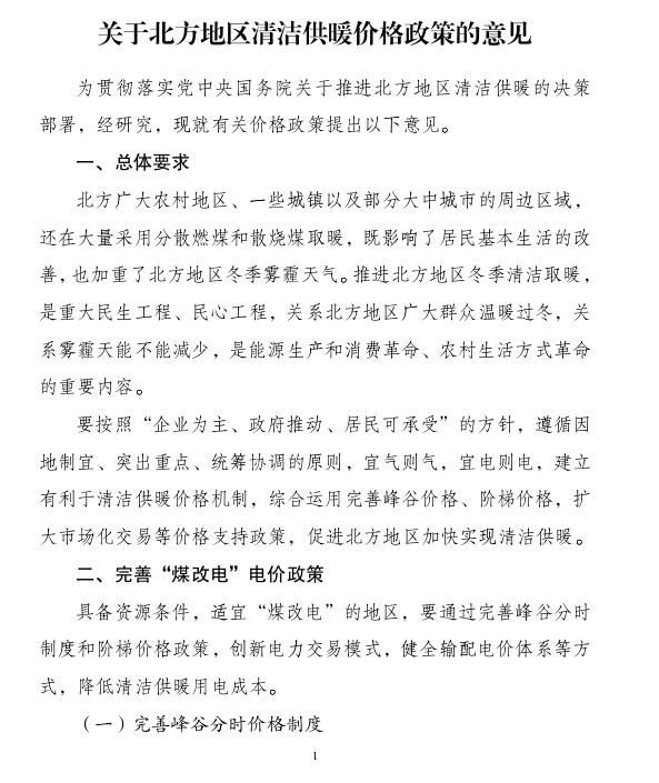 2017年9月25日,國家發(fā)改委發(fā)布《關(guān)于印發(fā)北方地區(qū)清潔供暖價格政策的意見》。涉及“煤改電”電價政策部分,《意見》中提出:具備資源條件,適宜“煤改電”的地區(qū),要通過完善峰谷分時制度和階梯價格政策,創(chuàng)新電力交易模式,健全輸配電價體系等方式,降低清潔供暖用電成本。