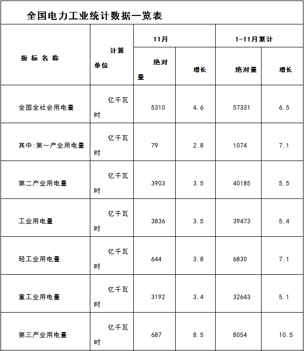 國家能源局發(fā)布1-11月份全國電力工業(yè)統(tǒng)計數(shù)據(jù)