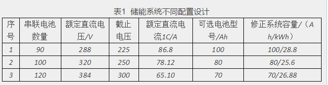 考慮到是光儲一體化的應用場景,充放電頻率按照平均一天一次;充放電電流最大1C。鋰離子電池儲能系統(tǒng),單體電池電壓為3.2V(標準),2.5V電壓截止。表1列出了滿足本系統(tǒng)要求的3種儲能系統(tǒng)的配置。