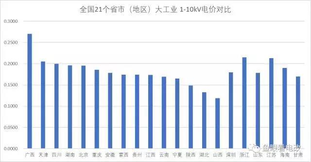 首先比較一下大工業(yè)用戶的總體的輸配電價(jià),我們以10kV電壓等級(jí)輸配電價(jià)為樣本,對(duì)21個(gè)省市(地區(qū))進(jìn)行橫向比較。