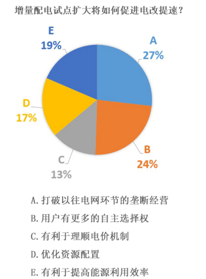 調(diào)查結(jié)果顯示,一半以上的受訪者認(rèn)為增量配電試點(diǎn)擴(kuò)大意味著打破以往電網(wǎng)環(huán)節(jié)的壟斷經(jīng)營(yíng),同時(shí)用戶有更多的自主選擇權(quán)。認(rèn)為增加增量配電業(yè)務(wù)改革試點(diǎn)也有利于理順電價(jià)機(jī)制、優(yōu)化資源配置、提高能源利用效率的受訪者比例相當(dāng),增量配電業(yè)務(wù)改革從多角度為促進(jìn)電改提速加油助力。
