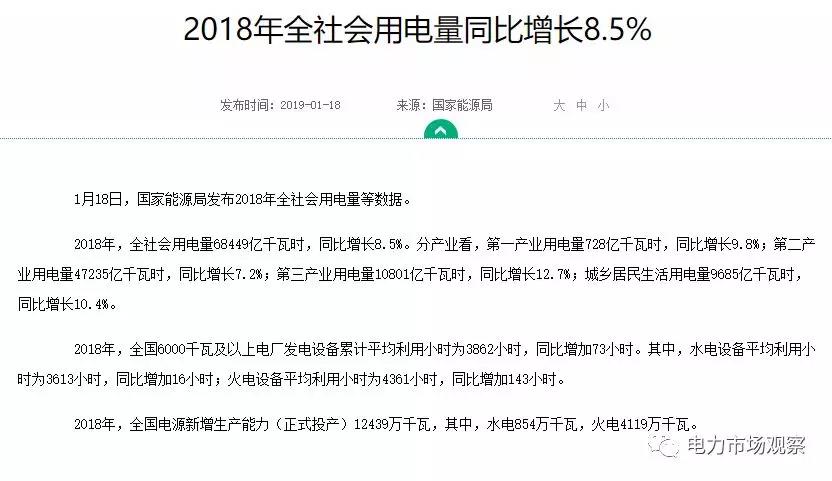 1月18日,國家能源局發(fā)布2018年全國電力工業(yè)統(tǒng)計數(shù)據(jù),其中包含了2018年全社會用電量等數(shù)據(jù)。
