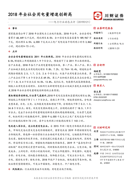電力行業(yè):2018年全社會用電量增速創(chuàng)新高