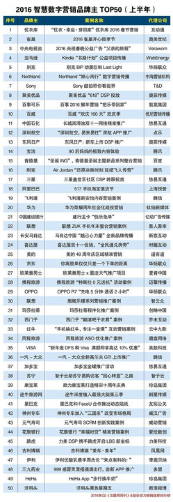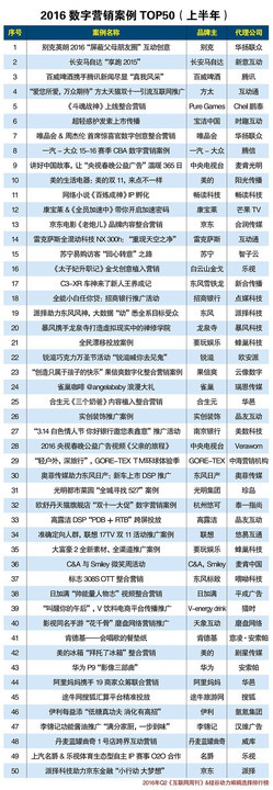 以下的《2016數(shù)字營(yíng)銷案例TOP50(上半年)》和《2016智慧數(shù)字營(yíng)銷品牌主TOP50(上半年)》,是本次通過行業(yè)內(nèi)外廣泛征集和調(diào)研,從所收集到的眾多營(yíng)銷案例中精選出的優(yōu)秀案例集。
