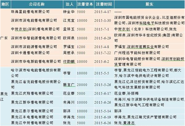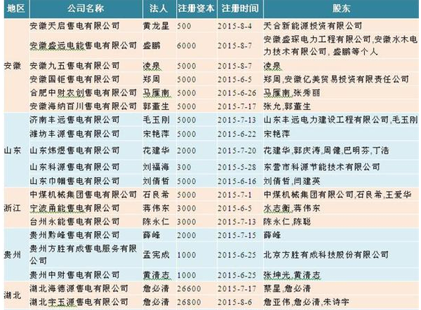 根 據(jù)前瞻產(chǎn)業(yè)研究院售電公司分析報(bào)告的不完全統(tǒng)計(jì),2015年3-8月半年時(shí)間,中國(guó)全國(guó)新成立獨(dú)立售電公司五十余家,各售電公司股東集中在電力設(shè)備、電力 工程、發(fā)電企業(yè)、能源投資、節(jié)能服務(wù)等公司及其他來(lái)自電力企業(yè)的自然人股東。其中,廣東、黑龍江、江蘇、河南、安徽、山東、浙江、貴州、湖北等東部和部分 中部省份新成立售電公司占比較大。在這些省份中,深圳市、湖北省、安徽省、貴州省都是新一輪輸配電價(jià)改革的試點(diǎn)城市。具體的公司情況如下表格所示。