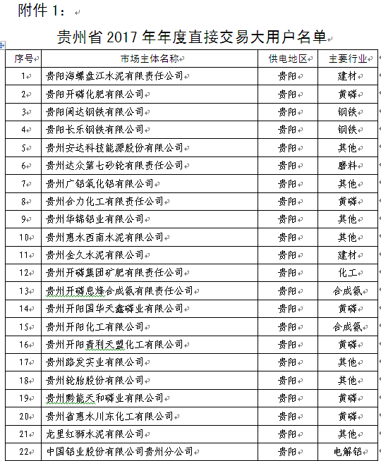 2、貴州省2017年年度直接交易大用戶名單(另附)