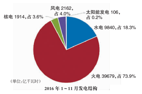 受電力需求回暖的帶動,2016年1~11月,全國發(fā)電量約5.4萬億千瓦時,同比增長4.2%,增速較2015年同期提高了4.1個百分點。其中,火電發(fā)電量同比增長2.2%,增速同比提高4.6個百分點。風電、核電發(fā)電量同比分別增長30.3%和20.5%,發(fā)電比重分別達到4%、3.6%。