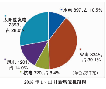 受煤電政策、環(huán)境約束等因素影響,2016年1~11月,全國新增裝機規(guī)模同比下降了5.4%,為8557萬千瓦。其中,火電新增裝機同比下降了30%,非化石能源新增裝機同比增長21%,比重進一步提升至60.9%,創(chuàng)下歷史新高。預計全年新增裝機規(guī)模將達到1.3億千瓦,同比下降1.7%。其中,非化石能源新增裝機比重為61.1%。期末總裝機容量達到16.5億千瓦,同比增長8.5%,非化石能源裝機比重達到36.2%,較2015年提高了2.1個百分點。