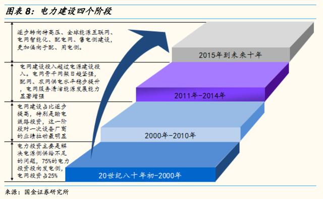 未來可以很清晰的預(yù)見, 我國電網(wǎng)建設(shè)投資的重心逐步由之前的主干網(wǎng)向智能化、配電側(cè)、售電側(cè)、用 電側(cè)轉(zhuǎn)移。根據(jù)投資節(jié)奏的分析來看,我國電力建設(shè)可分為以下四個(gè)階段: