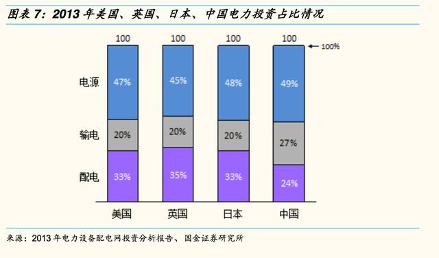 從電力結(jié)構(gòu)上看,和歐美國家相比,美國、英國、日本等國家的電網(wǎng)輸電 投資的一倍多,而我國配電網(wǎng)的投資則明顯弱后于輸電網(wǎng)投資。截至 2010 年 前后,從發(fā)電、輸電、配電來看,美國是 1:0.43:0.7;英國是 1:0.45:0.78,日 本是 1:0.41:0.68;而我國這一數(shù)字是 1:0.56:0.49,近些年雖然配網(wǎng)投資已逐 步超過輸電投資,但是配電網(wǎng)建設(shè)與發(fā)達(dá)國家配電網(wǎng)投資占比仍有不小空間。