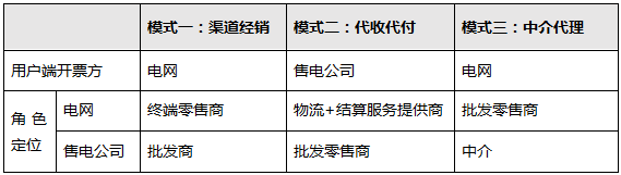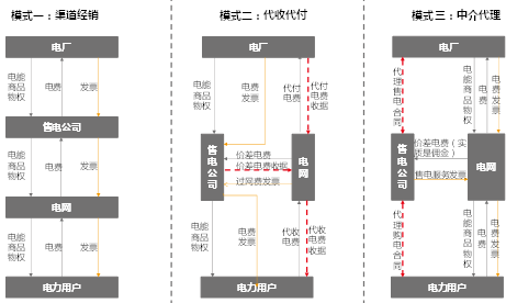 在這種模式下,電能作為商品,其物權(quán)從電廠到售電公司再到電網(wǎng)最終到電力用戶(物權(quán)流向取決于合同契約,與實(shí)際物流方向可以分離,電流方向仍然是電廠到電網(wǎng)再到用戶),售電公司出資向電廠采購電量,再賣給電網(wǎng),電網(wǎng)最終賣給電力用戶,收取電費(fèi)。物權(quán)流向與資金流方向相對,發(fā)票流向與物權(quán)流向方向相同,所有應(yīng)付的服務(wù)費(fèi)、手續(xù)費(fèi)都可以折算在上下游之間的差價(jià)里。