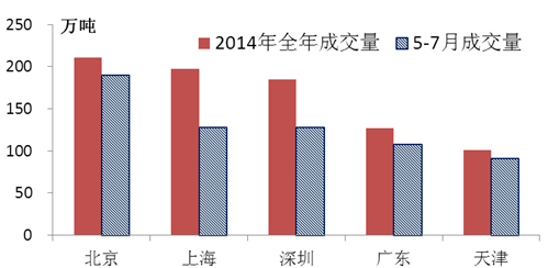 圖1-7 2014年試點(diǎn)碳市場(chǎng)履約期和全年成交量對(duì)比圖