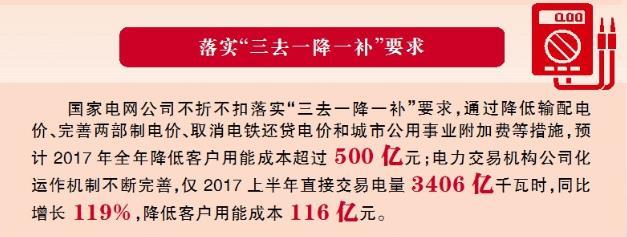 公司不折不扣落實(shí)“三去一降一補(bǔ)”要求,通過降低輸配電價、完善兩部制電價、取消電鐵還貸電價和城市公用事業(yè)附加費(fèi)等措施,預(yù)計2017年全年降低客戶用能成本超過500億元;電力交易機(jī)構(gòu)公司化運(yùn)作機(jī)制不斷完善,僅2017上半年直接交易電量3406億千瓦時,同比增長119%,降低客戶用能成本116億元。