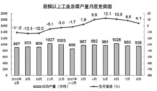 8月份,全國原煤產(chǎn)量2.9億噸,同比增長4.1%,增速比7月份回落4.4個百分點;較上月減少361萬噸,環(huán)比下降1.23%;日均生產(chǎn)938.0萬噸,比7月份減少11.6萬噸。1~8月份,原煤產(chǎn)量23.0億噸,同比增長5.4%,增速與前7月持平。
