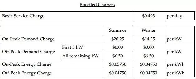 符合條件的家庭居民可以享受到如下電費政策:每個月每天繳納0.493美元的基礎(chǔ)服務(wù)費用,尖峰時刻(周一到周五的下午三點至8點)用電電費(Demand Charge)夏天是20.25美元/度,冬天是14.25美元/度,非尖峰時刻可以免費用5度電,其他時段用電電費(Demand Charge)則是6.5美元/度,除此之外,還有一個基本電費,尖峰時刻的基本電費(Energy Charge)夏天是0.0575美元/度,冬天是0.0475美元/度,非尖峰時刻的基本電費(Energy Charge)夏天和冬天都是0.0475美元/度。