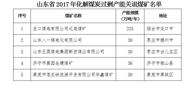 山東省2017年煤炭行業(yè)化解過剩產能情況公告