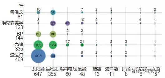 從新能源技術(shù)領(lǐng)域分布上看,各大油氣公司中,道達爾和殼牌更注重長期戰(zhàn)略規(guī)劃和把握未來發(fā)展方向,將太陽能優(yōu)先于生物質(zhì)作為發(fā)展重點。其他油氣公司相對更加保守,在專利技術(shù)選擇上將與自身經(jīng)營業(yè)務(wù)聯(lián)系更為緊密的生物質(zhì)作為戰(zhàn)略布局重點。因為燃料乙醇、生物柴油、生物航煤等液體生物燃料與常規(guī)成品油具有很強的相容性,汽車、飛機不經(jīng)改造或稍加改造就可使用,相比化石燃料含硫低,也可降低交通運輸領(lǐng)域溫室氣體排放。其次,燃料電池和氫能也是各大油氣公司關(guān)注的重點,這是考慮到未來在交通領(lǐng)域中電動汽車可能替代燃油汽車而做出的長遠(yuǎn)戰(zhàn)略布局。然而,在新能源中發(fā)展規(guī)模最大的風(fēng)能領(lǐng)域,各大油氣公司技術(shù)戰(zhàn)略儲備非常薄弱,主要以收購等方式開拓風(fēng)能業(yè)務(wù)。