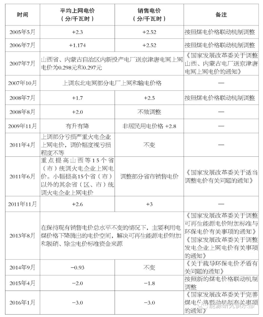 為解決“市場(chǎng)煤”與“計(jì)劃電”矛盾,2004年12月15日,國家發(fā)展改革委出臺(tái)《關(guān)于建立煤電價(jià)格聯(lián)動(dòng)機(jī)制的意見》,建立煤電聯(lián)動(dòng)機(jī)制,以不少于6個(gè)月為一個(gè)煤電價(jià)格聯(lián)動(dòng)周期,若周期內(nèi)平均煤價(jià)變化幅度達(dá)到或超過5%,將相應(yīng)調(diào)整電價(jià)。2005年以來電價(jià)調(diào)整情況見下表。